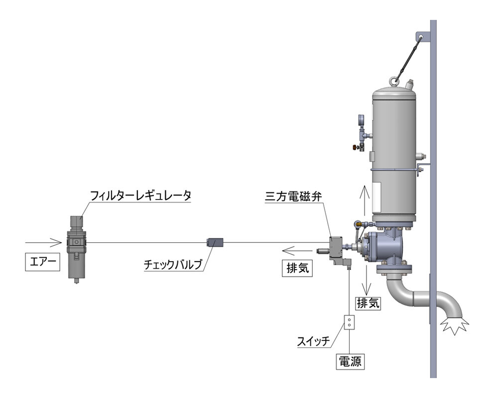 大型タンクやサイロ内に滞留した粉粒体に、蓄圧された圧縮空気を瞬時に噴射することで、爆発的な勢いで閉塞していた粉粒体を破壊する装置です。