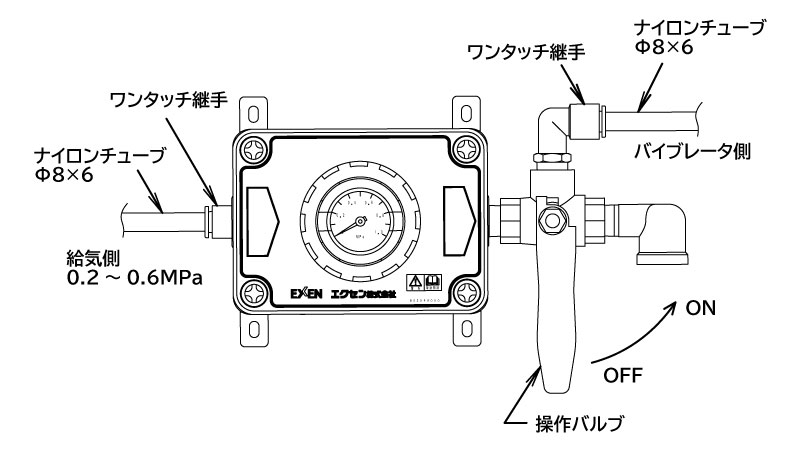 ※本機との配管は、ナイロンチューブ(外径φ8、内径φ6)を使用し、エアーバイブレータまでの配管は出来るだけ短くして下さい。