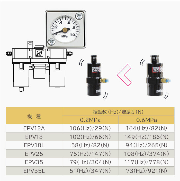 ピストンバイブレータEPVシリーズは、ピストンの上下運動により安定した振動を与えるエアー式バイブレータです。 主に粉粒体のホッパーやタンク・配管シュートなどの閉寒防止や充填をはじめ、テーブル振動機、振動輸送機、振動選別機などの振動源として使用されます。 ピストンバイブレータEPVシリーズはオイルフリーで使える為、環境にもやさしく、耐食性にも優れている為、薬品・食品・化学業界など幅広い業界で使われています。 ※起動、停止の制御には、ノーマルクローズの3方弁をご使用ください。